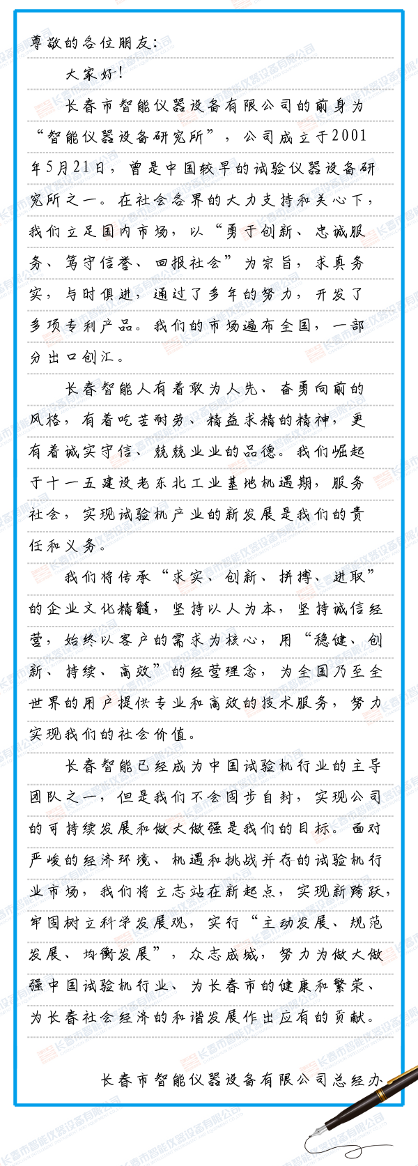 長春市智能儀器設(shè)備有限公司于2001年5月3日注冊成立,注冊資本500萬元,是由吉林大學(xué)等四所大學(xué),中科院應(yīng)用化學(xué)研究所,國家電化學(xué)測試中心等三個研究所,四個儀器制造廠組建的實體機(jī)構(gòu),是集自主研發(fā)、生產(chǎn)、售后服務(wù)等全過程于一身的科技型民營企業(yè),是國內(nèi)較早開發(fā)、生產(chǎn)試驗機(jī)的企業(yè)。我們專門從事光機(jī)電一體化的試驗儀器、分析儀以及汽車零部件的檢測儀器的研發(fā)、制造。